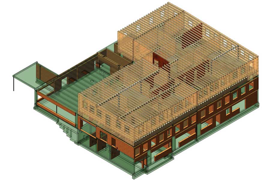Bestand in Massivbauweise, Aufstockung in Leichtbauweise als Holzrahmenbau