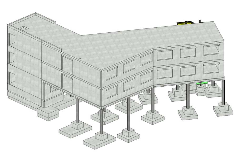 Konstruktion in weiten Teilen aufgeständerter „Stelzenbau“ (erdgeschossiger Eingangsbereich und Treppenhaus, Büroräume im ersten und zweiten OG auf Stützen)