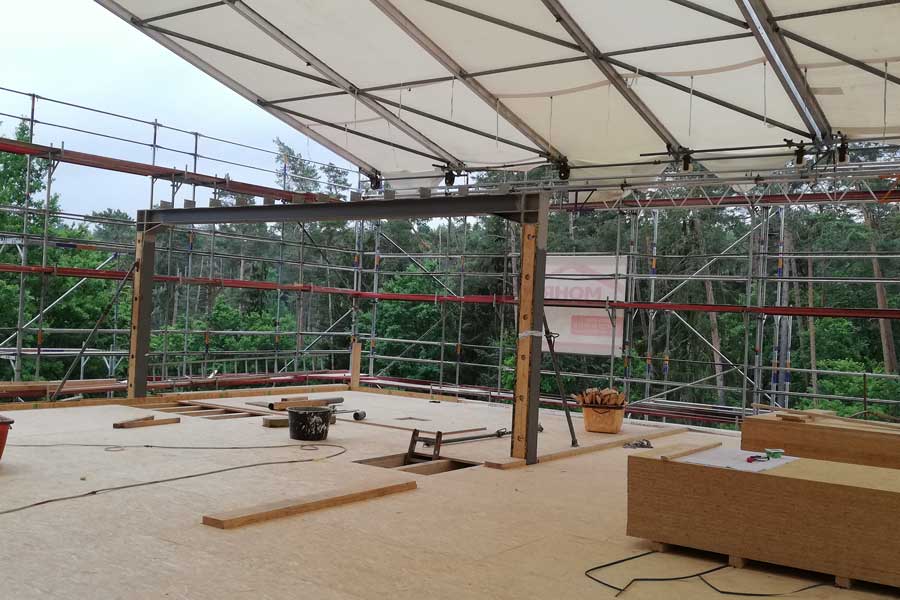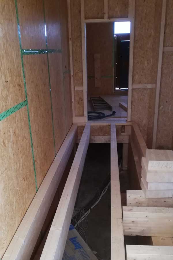 Die Gebäudeaussteifung erfolgt hauptsächlich über die Holzrahmenwände sowie zwei Stahlrahmen