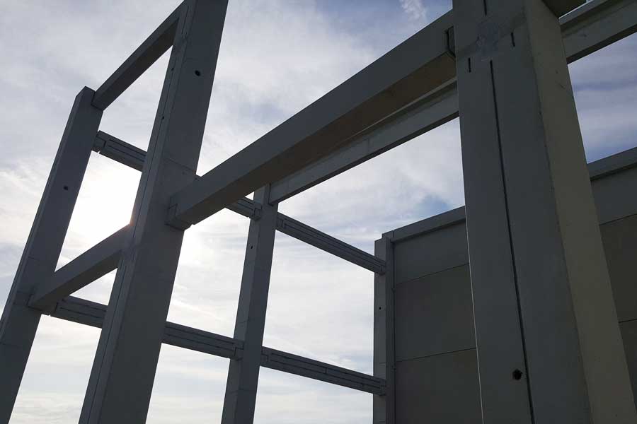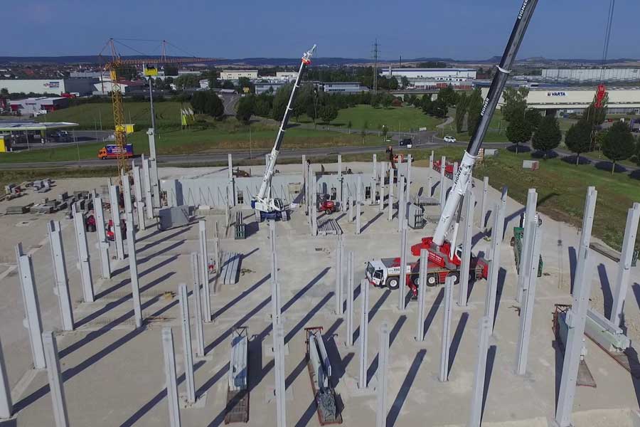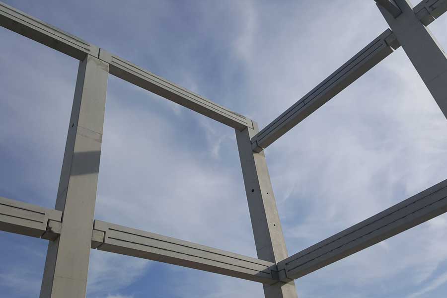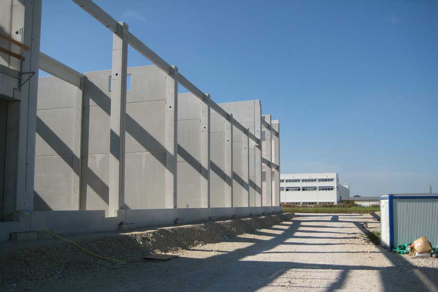Produktionsgebäude eingeschossig (Grundfläche ca. 7.000m²), Dachtragwerk aus Spannbeton-Dachbindern mit einem T-Querschnitt