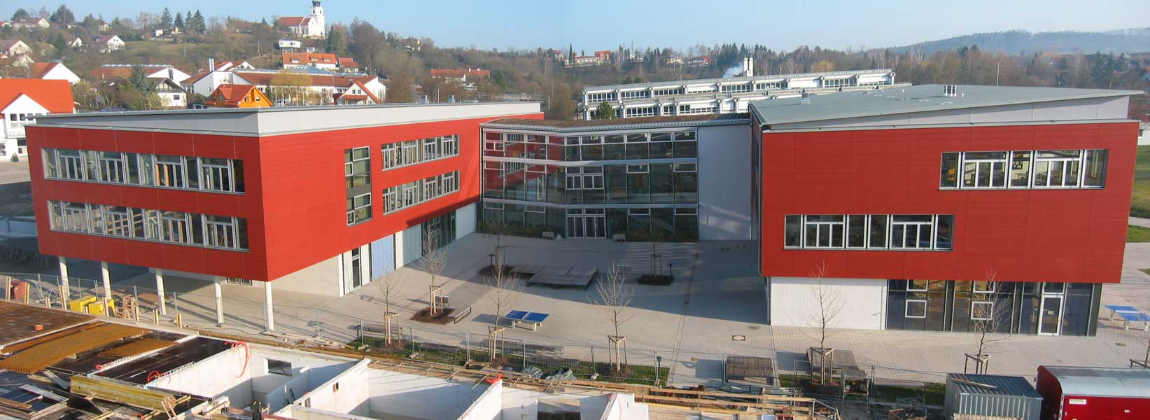 Das Schulgebäude gliedert sich in zwei dreigeschossige Riegel mit einem verbindenden Mittelbau. Im Ostbau befinden sich über einer großzügigen Pausenhalle die Verwaltung und die naturwissenschaftlichen Räume. Sowohl der Ost- als auch der Westbau hat ein leicht geneigtes Pultdach mit Aluminiumblechdeckung. In Kontrast dazu wurde für den Mittelbau eine extensive Dachbegrünung gewählt.