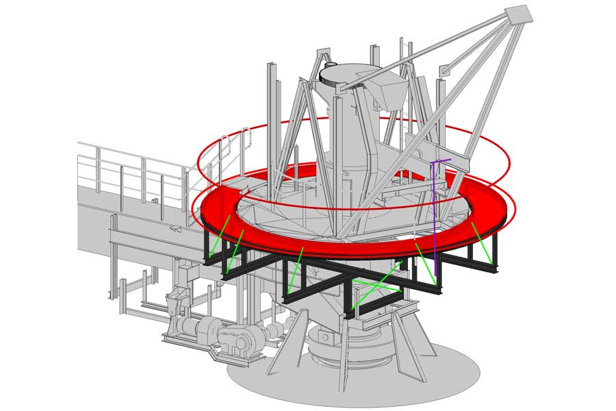 Während sich die Mischanlage um ihre eigene Achse dreht, soll die Stegerweiterung fest installiert sein und an jeder Stelle für das Wartungspersonal sicher betretbar sein